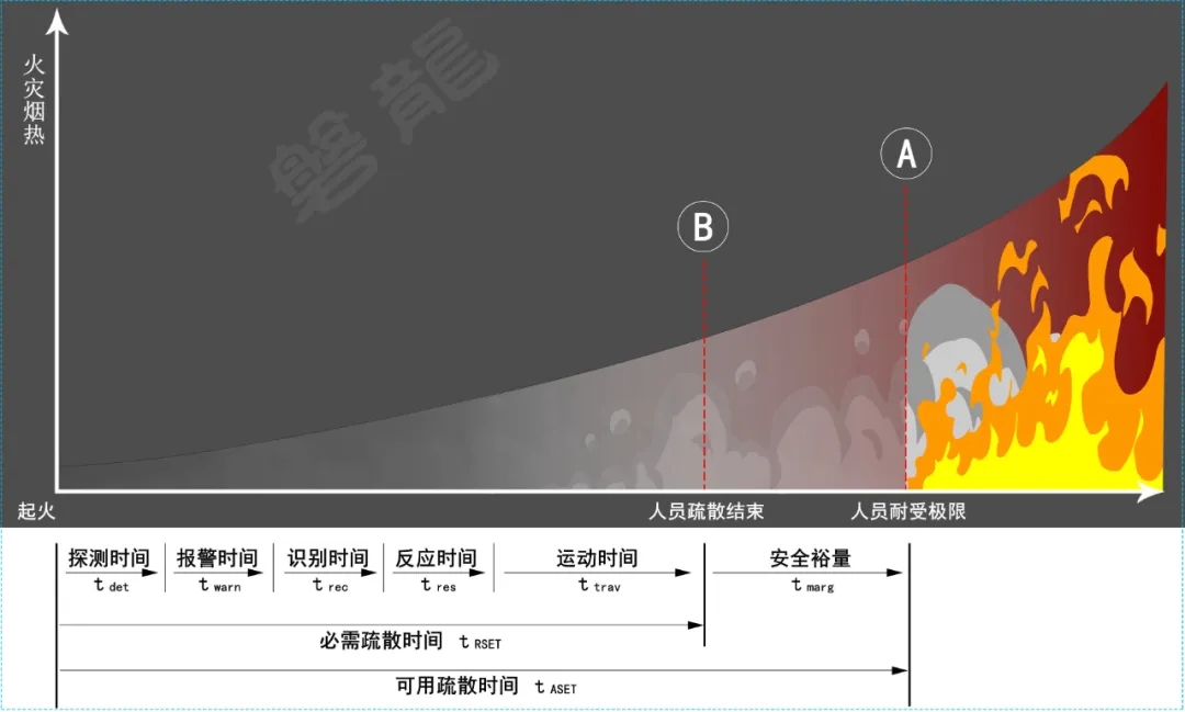 可用疏散时间:自火灾发生起,至环境条件恶化至威胁人身安全前的时间。在【图示1】中,就是从火灾发生起至A点的时间。
