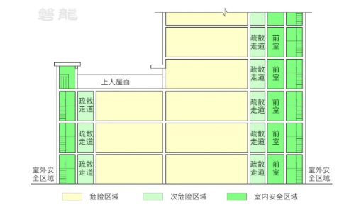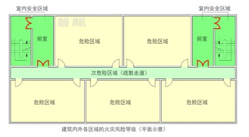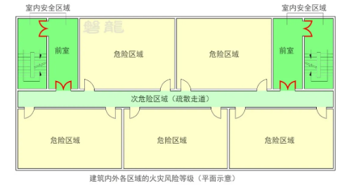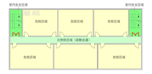 疏散走道是疏散通道的一部分,通常指从房间疏散门至安全出口之间的路径。疏散走道属于次危险区域【图示3】,其基本要求如下: