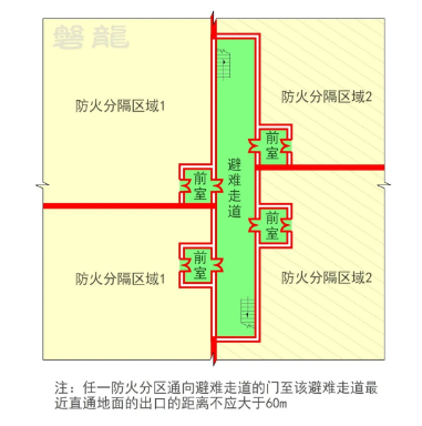 (2)疏散走道:是疏散通道的一部分,通常指从房间疏散门至安全出口之间的路径。