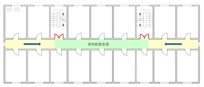 根据安全出口的数量及房间疏散门的相对位置,疏散走道的疏散形式可分为双向疏散走道和单向疏散走道【图示1】。