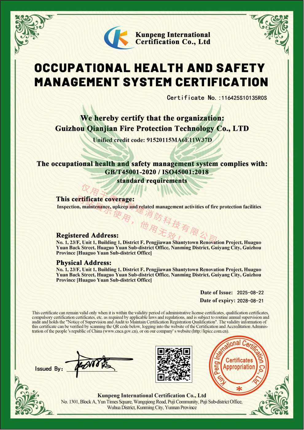 职业健康安全管理体系认证证书