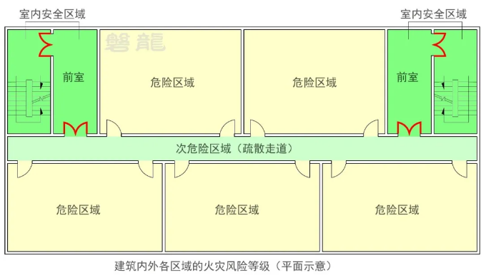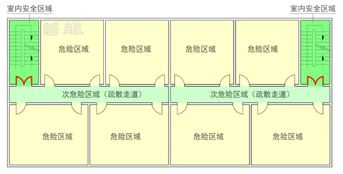 因此,建筑内的室内危险区域(包括各类房间及功能空间)均应具备不少于2个安全出口,且人员应可以在两个安全出口之间进行转换,以避免因单一出口失效导致的疏散风险。